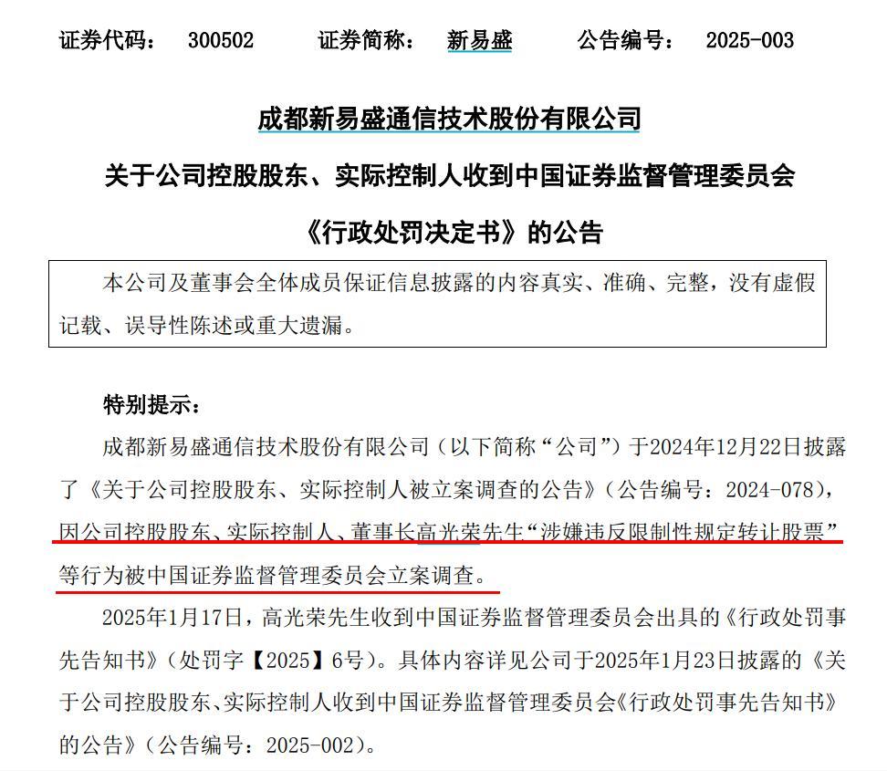 微成都报道 国内光模块龙头成都新易盛通信技术股份有限公司(以下简称“新易盛”;300502.SZ)股价再创历史新高!高光荣当天收到证监会出具的《行政处罚决定书》,其中,