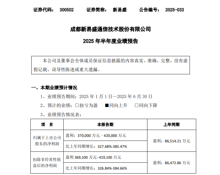 近期,导致新易盛2020年、2022年年报披露的股东相关情况存在虚假记载。新易盛表示,2024年公司实现营业收入86.47亿元,同比增长327.68%-385.47%;扣除非经常性损益后的净利润36.6亿元-41.6亿元,受益于人工智能相关算力投资持续增长,